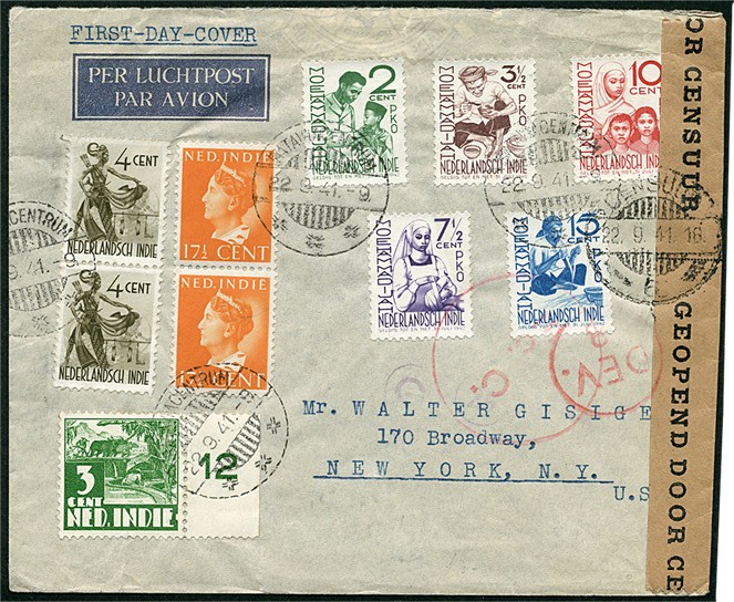 Moehammadijah-serie nrs. 293-297 afgest. op de eerste dag van uitgifte te Bataviacentrum 22-9-1941, tezamen met 3c, 2x 4c en 2x 17½c op in Indië en Singapore gecensureerde luchtpostenv. naar New York