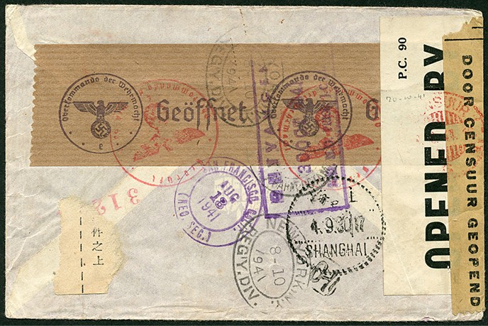Op zoek naar de geadresseerde. R-env. uit Schiebroek / Kleiweg 24-7-1941, met Duitse censuur, per Transatlantische Clipper via New York 10-8 en San Francisco 13-8 naar Shanghai 4-9-1941, geadresseerde blijkt opvarende van de 'Tjikarang' van de J.C.J.L. en via Batavia doorgestuurd naar Tjilatjap en vandaar op 15-1-1942 naar de JCJL te Soerabaja. Bijzondere zwerfbrief!