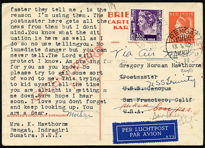 DE VAN KONIJNENBURGBRIEFKAART G70 (VRIJWEL PRACHTKAART) BIJGEFR. MET 35 CENT VOOR HET LUCHTRECHT NAAR DE U.S.A. EN VERZONDEN UIT RENGAT 13-1-1942, MET AANGRIJPENDE TEKST VAN EEN MOEDER AAN HAAR ZOON. TARIEF: ZIE SvL, NITAR 467-468