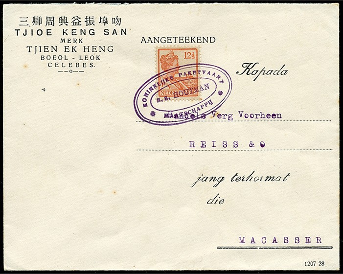 Firmacouvert uit Boeol (= Bwool)-Leok gefr. met 12½c luxe afgest. met KPM-ovaalstempel 's.s. HOUTMAN' naar Makasser 18-10-1928