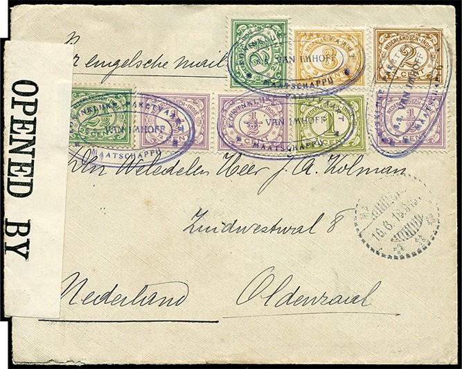 Env. met 12½ cent aan cijferzegels gefr. 4x afgest. met KPM-ovaalstempel 's.s. VAN IMHOFF' via Makasser 16-6-1918 per Engelse mail, gecensureerd, naar Oldenzaal 26-8
