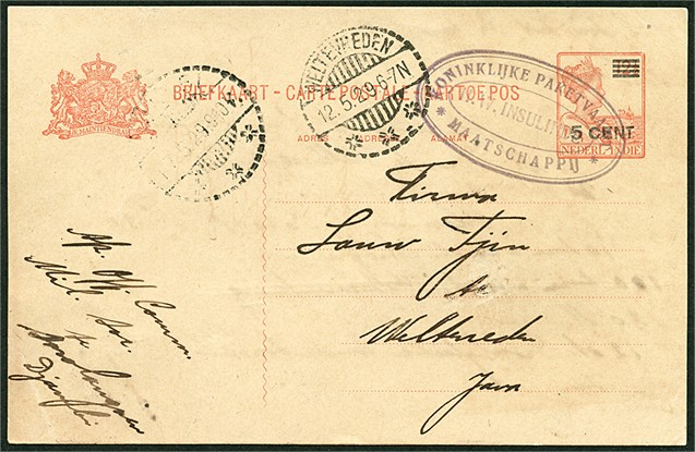 Bk. G40 uit Sarolangoen (Djambi, aan de rivier Tembesi) afgest. op een hekwieler met het KPM-ovaalstempel 'H.W. INSULINDE' via Djambi 7-5-1929 naar Weltevreden 12-5. Afstempelingen van hekwielers zijn bijzonder zeldzaam, en zeker in deze kwaliteit! Ex Verkuil