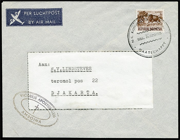 Luchtpostenv. uit Amboina gefr. met 50s afgest. met KPM-rondstempel 'ms. Karossa' naar Djakarta (az. geschreven datum 2-8-56). Buitengemeen zeldzaam! Ex Verkuil