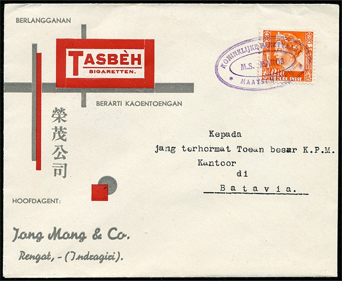 Attractief couvert uit Rengat (Sumatra) gefr. met 12½c afgest. met KPM-ovaalstempel 'M.S. MAROS' naar Batavia 19-1-1936