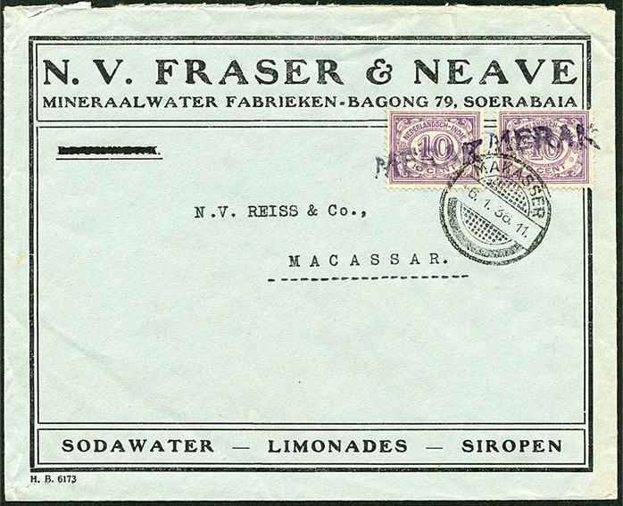 Prentbk. gefr. met 5c afgest. met KPM-naamstempel 's.s. MERAK' (1930) en firmacouvert gefr. met 2x 10c 2x afgest. met KPM-naamstempel 'MERAK' (1936)