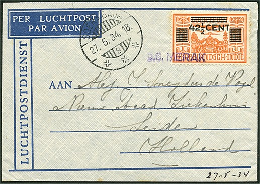 Luchtpostcouvertjes uit 1934 naar Nederland gefr. met 35c resp. 42½c, afgest. met resp. KPM-ovaalstempel 'S.S. MERAK' en KPM-naamstempel 's.s. MERAK'