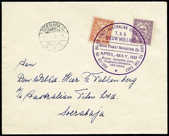 First Australian Exhibition Ship to the East April-May 1933. Env. gefr. met 2½c en 10c superbe afgest. met groot gelegenheidsstempel van het T.S.S. 'NIEUW HOLLAND' naar Soerabaja 1-5. Ex Verkuil