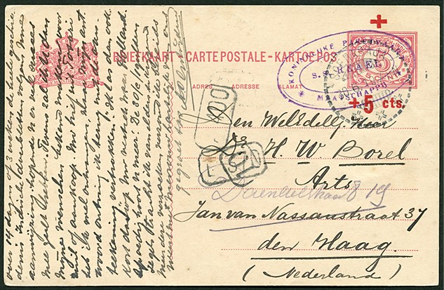 Rode Kruisbk. uit Makasser afgest. met KPM-ovaalstempel 's.s. REAEL' via Soerabaja 30-6-1919 naar Nederland. Slechts weinig RK-briefkaarten met KPM-stempels bekend