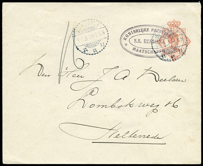 Env. G47 afgest. met KPM-ovaalstempel 'S.S. RENSIENA' via Menggala 30-8-1928 naar Weltevreden 1-4. Het stoomschip RENSIENA heeft maar van mei 1928 tot februari 1929 als KPM-schip gefunctioneerd. Dit is de enig bekende afstempeling op poststuk. Ex Van Affelen van Saemsfoort, Verkuil en Kerzner