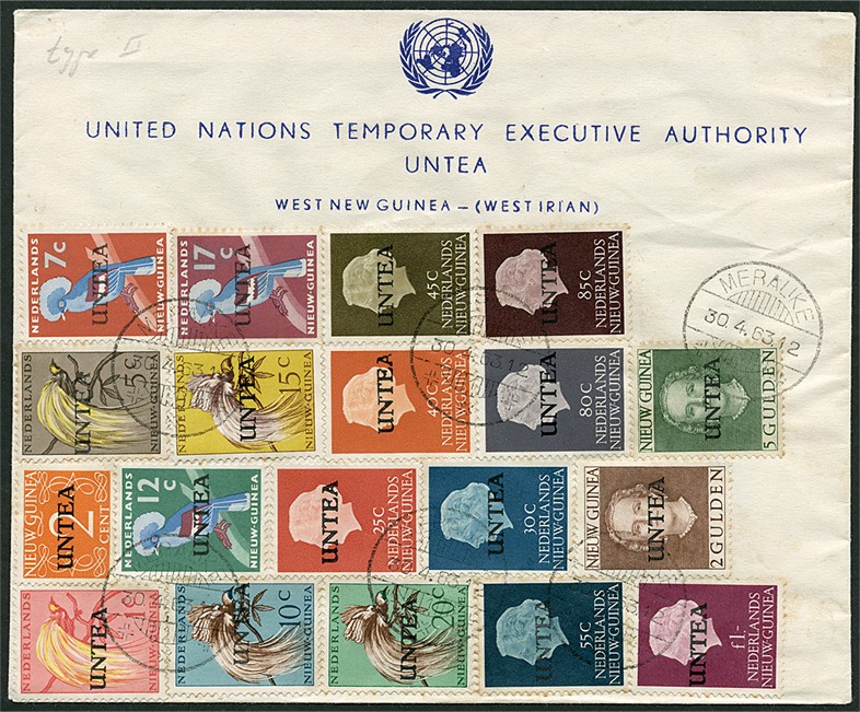 UNTEA serie (pracht- en vrijwel prachtex.) bestaande uit een mix van 1e en 2e druk op UNTEA-couvert, afgestempeld Merauke 30-4-1963, de laatste dag van geldigheid