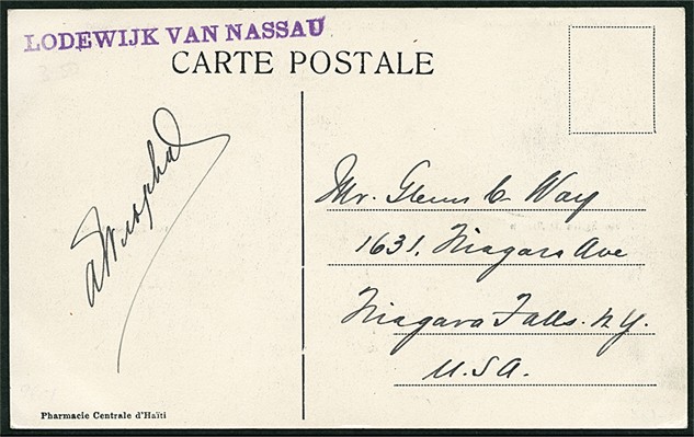 Prentbk. uit Haïti 23-4-1914 waarop violet KWIM-naamstempel 'LODEWIJK VAN NASSAU'. Uitermate zeldzaam!