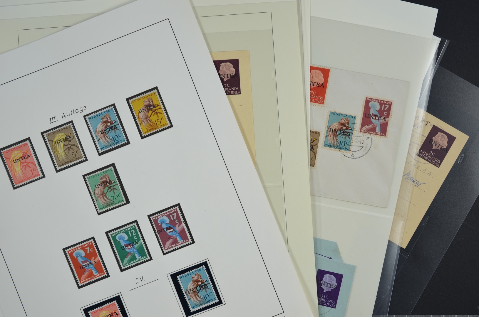 NEDERLANDS NIEUW GUINEA speciaal-verzameling Untea met alle types, alsmede briefkaarten, Luchtpostbladen, brieven, stortingsbiljet en blokken van vier. Leuke koop voor de specialist !