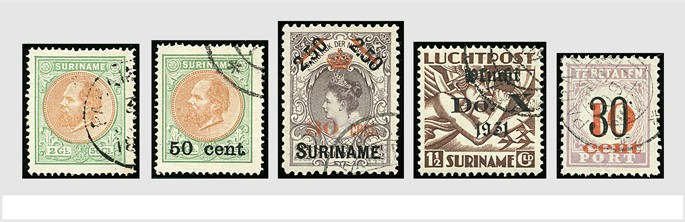SURINAME 1873-1940, o/* verz. op albumbladen met o.a. 1/15, 37/40, 60/64, 104/110, LP8/14, P1/16, etc.