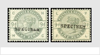 S.G.195, 9 Pence dull green HC + FL, 2 copies with Specimen overprint, one with inverted wmk., both very fine unused with full original gum