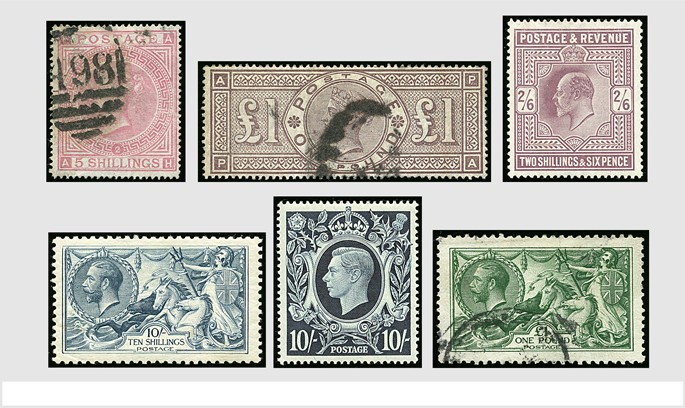 ENGELAND, ongebruikt waarbij S.G. 260, 400 en 478 en gebruikt 127 Plate 2, 128, 10 Sh. greenish grey, zeer zwaar gestempeld, 185 £.1,- lila Three Crowns, 265, 402 en 403, £.1,- green. Totale cat.wrd. ruim £.12.000
