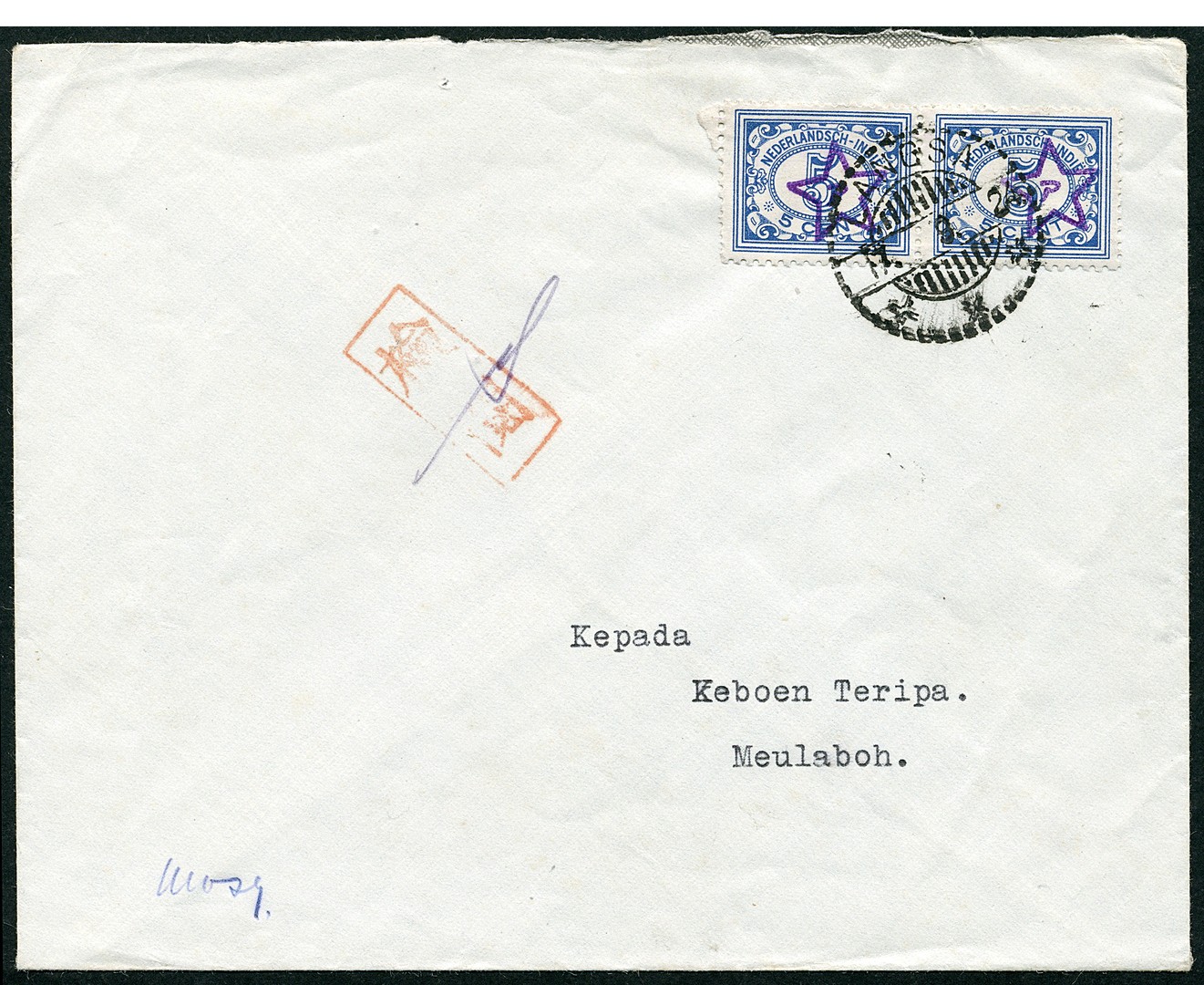 5 Cent numeral with violet Atjeh star overprint no. 11v-42 in pair on cover from Langsa 17.9.24 to Meulaboh. Censor Bu.JC12a in orange