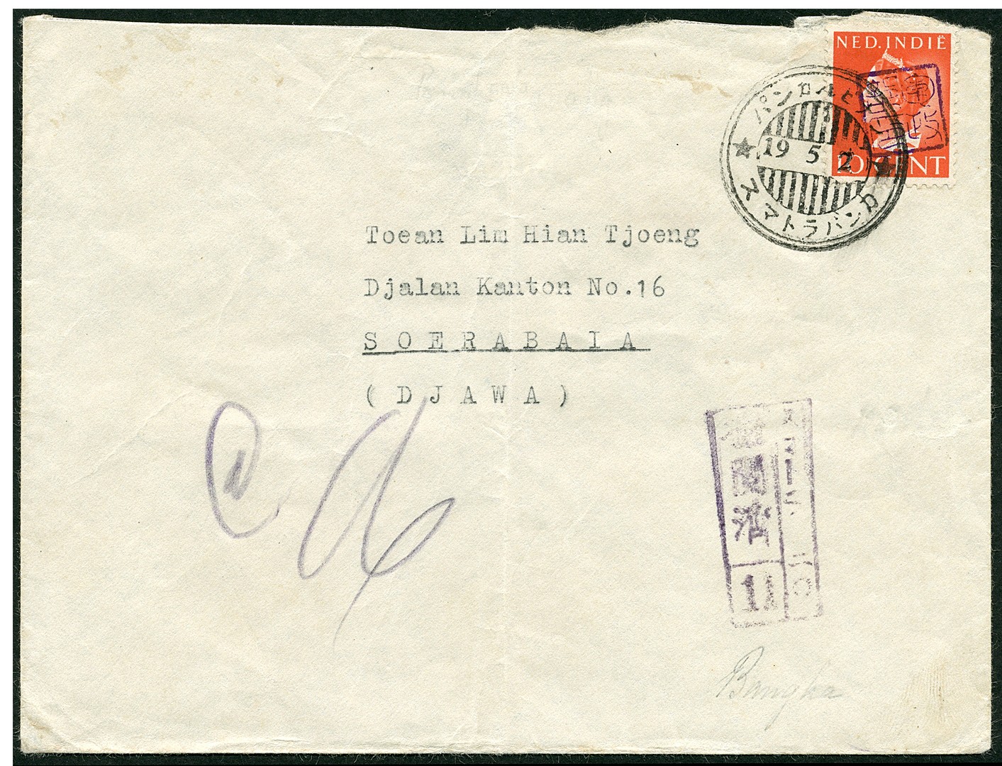 10 Cent van Konijnenburg with violet overprint for Banka and Billiton no. 70v-43" on cover from Pangkalpinang 19.5.2 (type 220) to Soerabaja (Java). Censors Vr.313 and 207 number 20 from Palembang (on the back)
