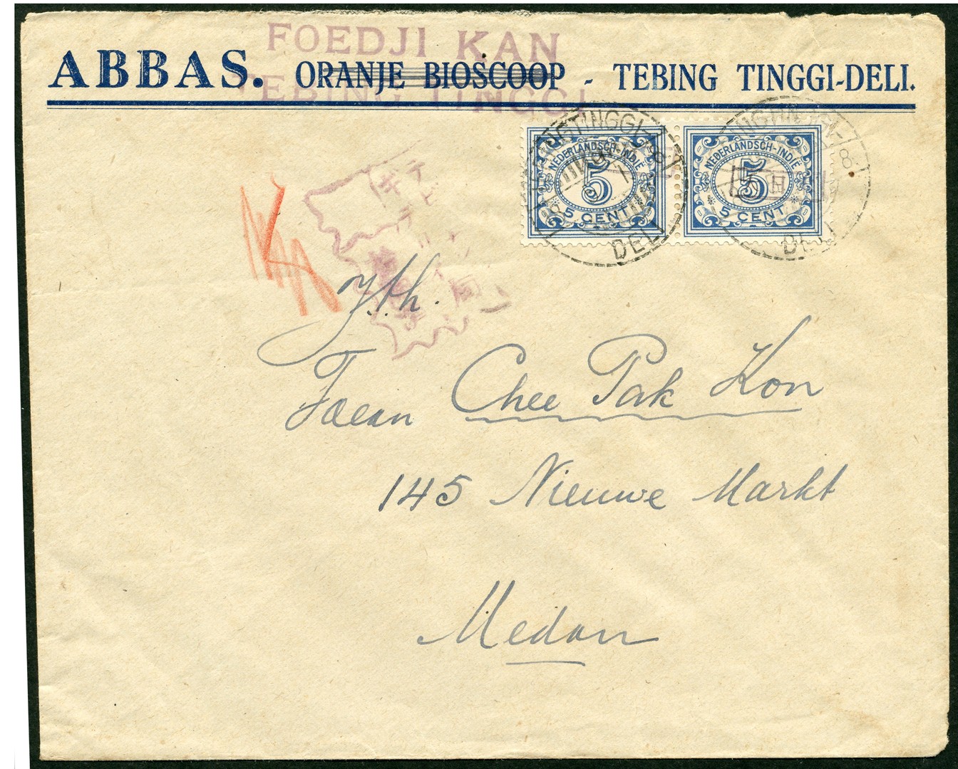 5 Cent numeral with black framed Dai Ni Hon overprint no. 821z-42 in pair on 'Foedji Kan' cover from Tebingtinggi- / Deli 18.5.1.8 to Medan. Censor Vr.312 from Tebingtinggideli