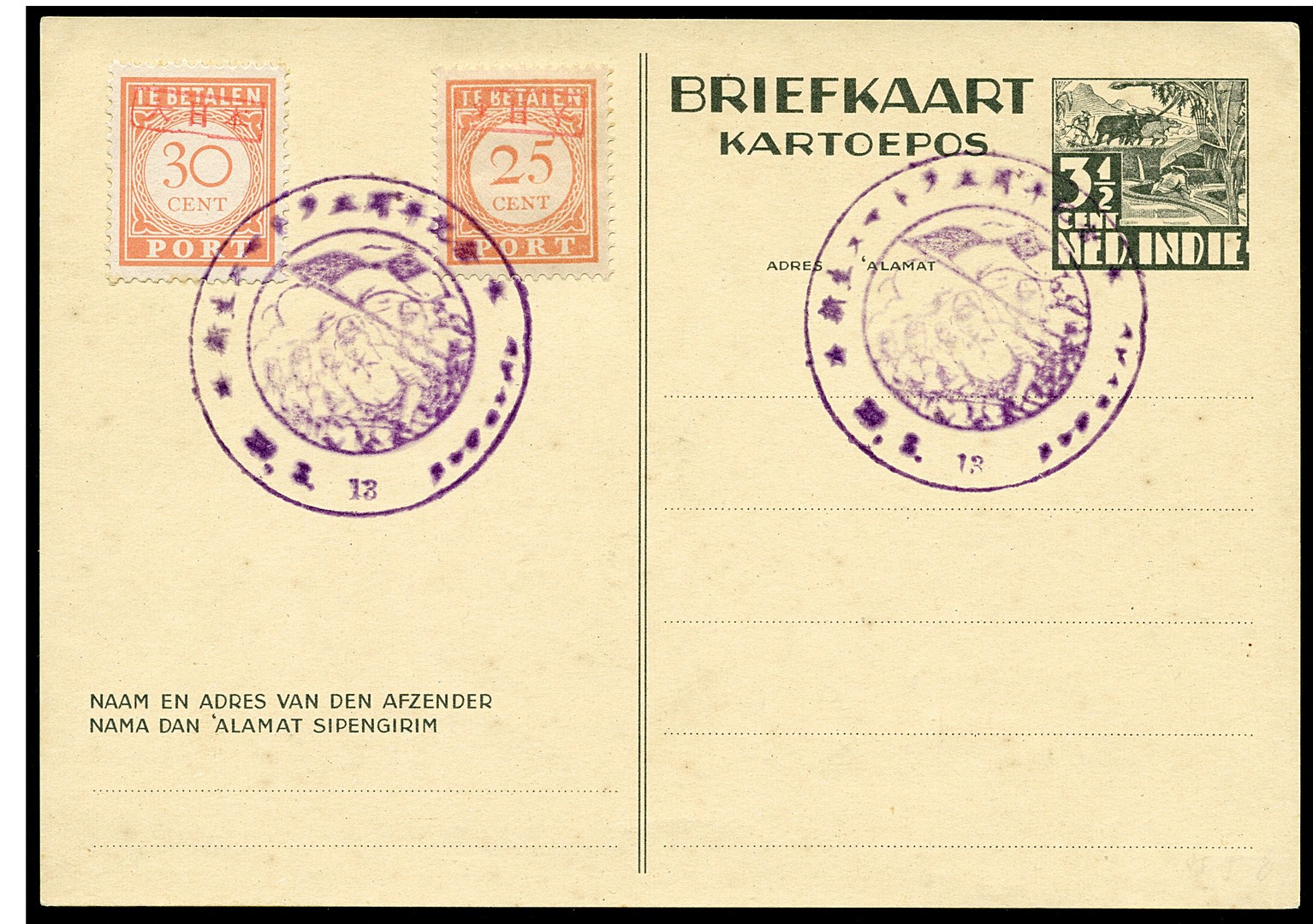 'Third Anniversary of the Rebirth of Sumatra' in violet (type 435) from Tandjongbalei on a 3½ cent postcard