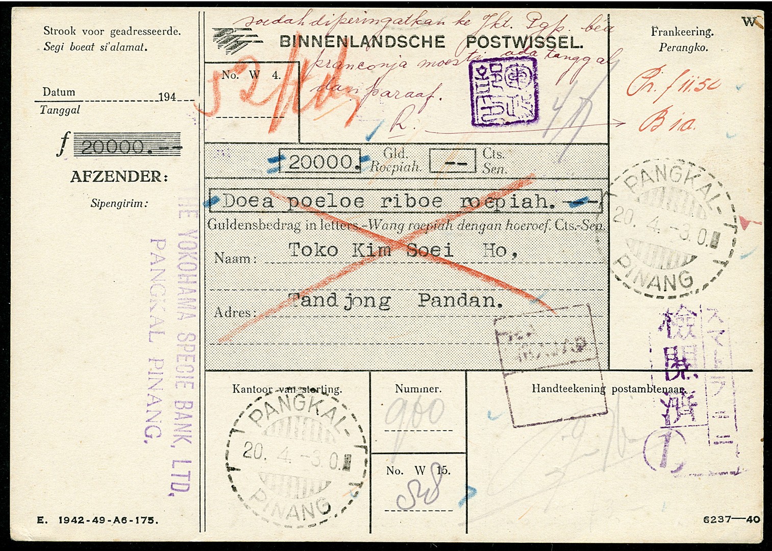 Banka. Written postage paid 'ƒ 11.50 / B.i.a.' and cachet 'BEA / BAJAR' (Bu. JB3) on complete M.O. Bu.JF1a showing violet overprint for Banka and Billiton 70v from Pangkal- / Pinang 20.4.-3.0 to Tandjongpandan 20.5.2. Written 'soedah diperingatkan ke Jkt. Pgp. bea pranconja moesti ada tanggal dan paraaf' (Jakarta has been informed already, costs and paraph must be written'. Censor Bu.JC15