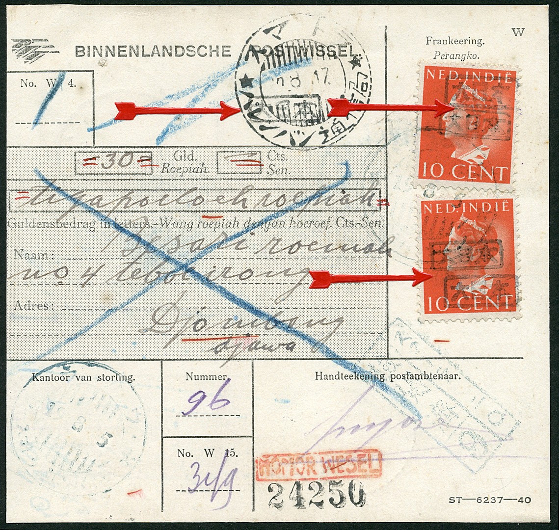 Palembang. 10 Cent van Konijnenburg with double framed Dai Ni Hon overprint no. 825z-43" on M.O. Bu.JF1a showing framed Dai Ni Hon overprint 82z from the very rare sub-post office of RANAU 19.3.5. (type 220 in blue, vNV RR) via the trans communication office of Palembang 19.8.17 (type 502) to Djombang (Java) 14.9.04.11. Censor Bu.JC15