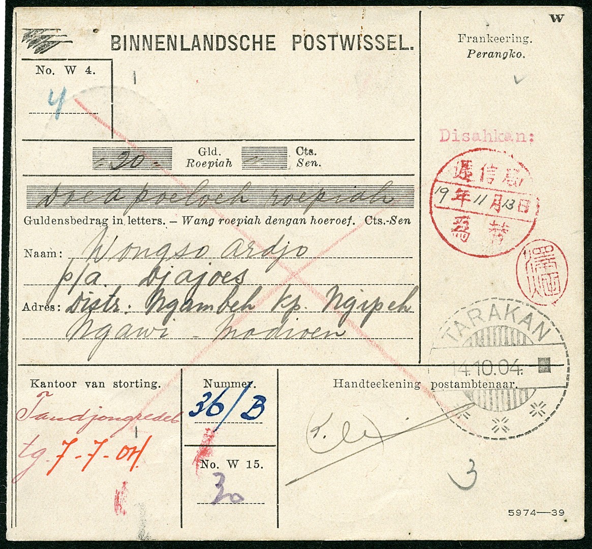 Official circular cachet in red with chop and typed 'Disahkan:' (= authorized) on M.O. Bu.JF41a from Tandjongredeb tg. 7-7-04 (hand-written name) via Tarakan 14.10.04 to the small sub-post office of Ngrambe 21.2.05.21 (Java). Rare! Ex Mattern