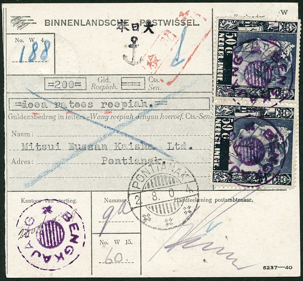 50 CENT KREISLER WITH VIOLET ANCHOR NO. 43v-34a IN PAIR ON M.O. Bu.JF41a SHOWING BLACK ANCHOR OVERPRINT 43z CANCELLED DELIVERY HOUSE BENGKAJANG IN VIOLET (TYPE 071) WITH HAND-WRITTEN DATE 2604-7-29 TO PONTIANAK 2.8.04. CENSOR Bu.JC4 IN RED FROM PONTIANAK. AN EXTREMELY RARE POSTAL ITEM OF WHICH ONLY A FEW ARE RECORDED. EX MATTERN