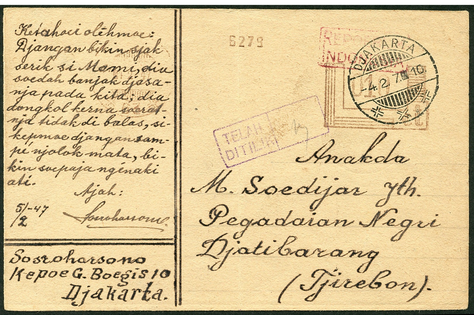 Postcard home-made with 10 ct from franking machine Bu.RJ10f from Djakarta -4.2.7.10 (type 013) to Djatibarang. Censor Bu.RC1d