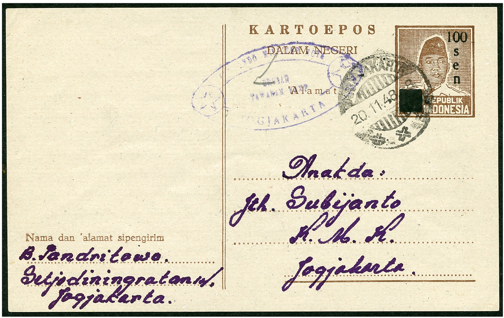 Republican internee camp in Djokjakarta for those who participated in the communist insurgency of Madioen in September 1948. 100 Sen postcard Bu.RJ26 from Djokjakarta 20.11.48.-8 to a prisoner. Blue oval cachet 'KOMMANDO MILLITER KOTA / URUSAN / TAWANAN KAMP / JOGJAKARTA'. Rare and most interesting