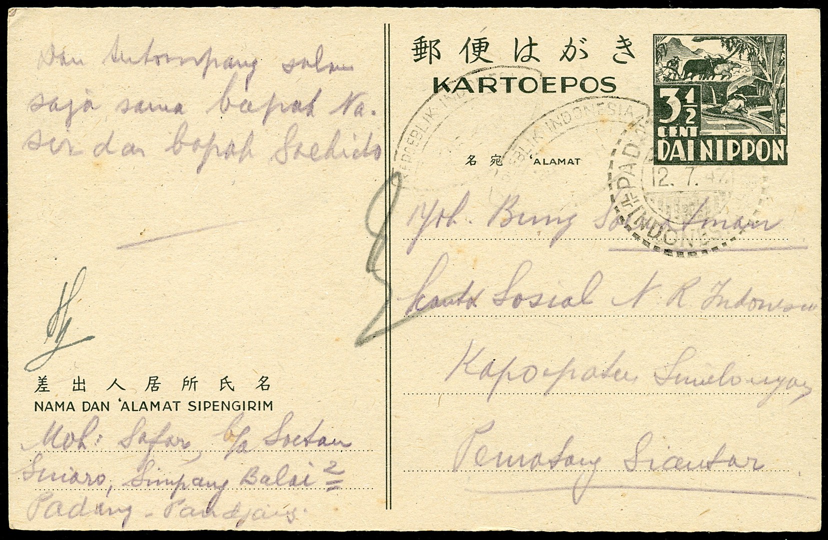 3½ Cent postcard showing two faint strikes of the oval 'REPOEBLIK INDONESIA / 75 SEN' overprint Bu.RS43b from Padangpandjang 12.7.47 (type 260) to Pematangsiantar