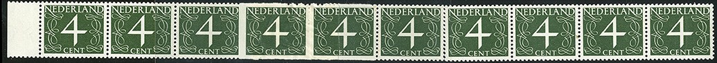 464c, 4 cent Van Krimpen in horizontale strip van tien met papierlas en tussen de 3e en 4e zegel van links ongetand. Spectaculaire fout en maar weinig aangeboden! € 1150+