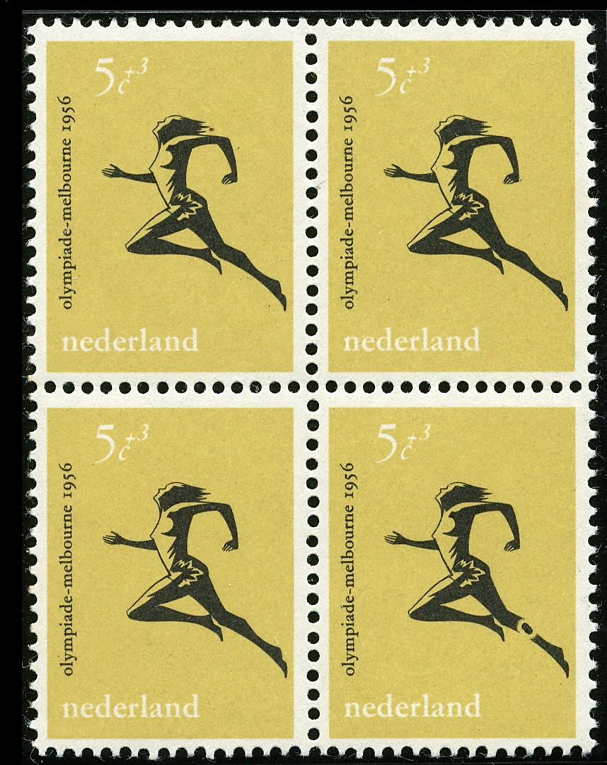 677PM, 5+3 cent Hardloper met plaatfout "witte ring in rechterkuit, postfris prachtex. in blok van vier met drie normale ex. €.280