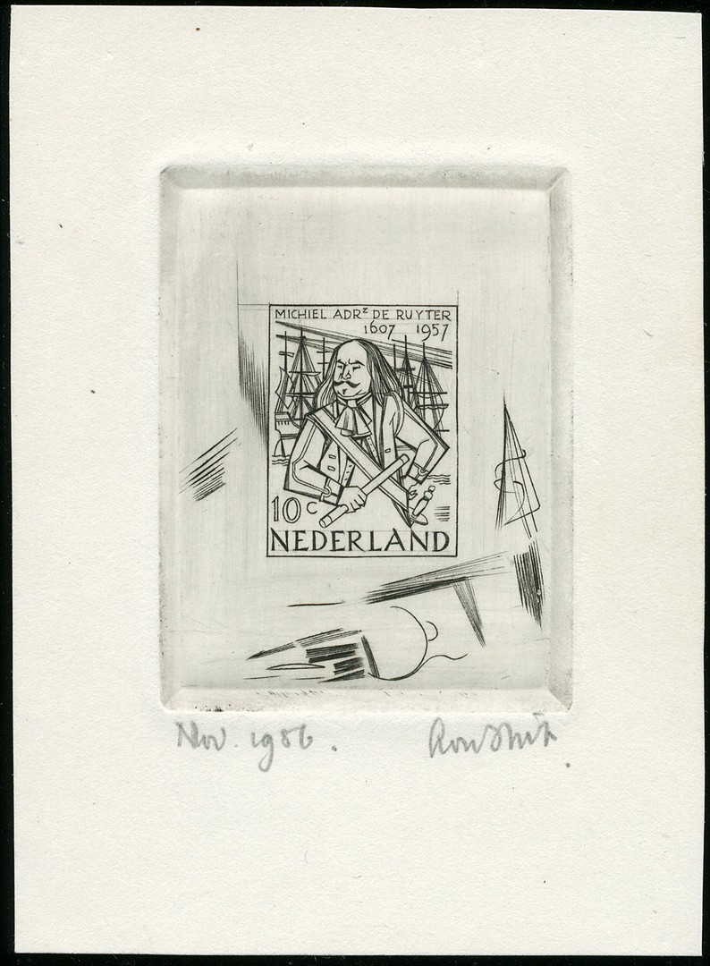 De Ruyter 1957. Ontwerpproef van de 10 cent nr. 693 in gewijzigde tekening, in zwart, in plaatdruk op een velletje van ca. 76 x 105 mm van kartonpapier, met in potlood geschreven 'Nov. 1956.' en de handtekening van de ontwerper 'Lou Strik', PC.302a. Prachtex. Slechts enkele exemplaren bekend en hoogst zelden aangeboden! Fl. 1000++