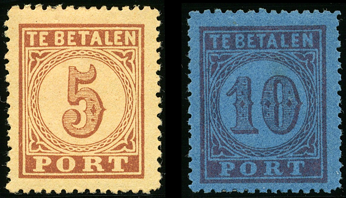 1/2, 5 cent bruin op oranje en 10 cent karmijn op blauw, ongebruikte luxe set ! €.600