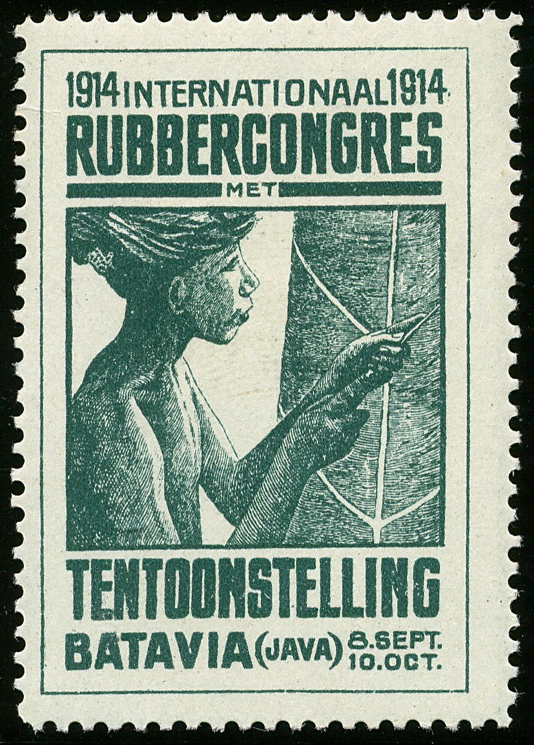 Propaganda. 15 Sluitzegels (rubbertapper) in 8 verschillende kleuren voor het Internationale Rubber Congres met Tentoonstelling van 8 sep. t/m 10 okt. 1914 te Batavia, met plakkers op kartonpapier (enkele ex. vastgeplakt)