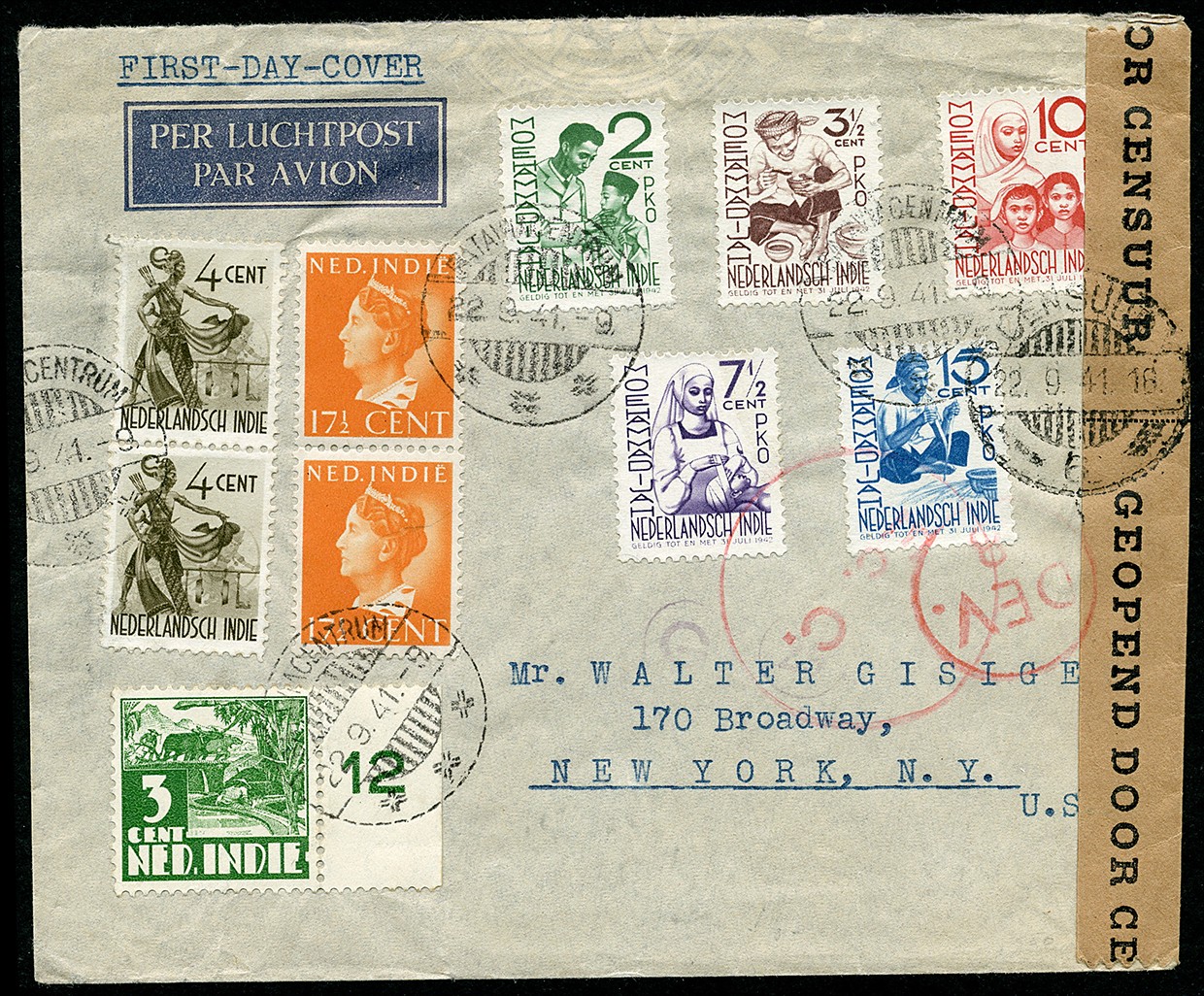 293/97, serie Moehammadijah op mooie gecensureerde luchtpostenvelop met nrs. 249, 276 in paar en 301 in paar, afgestempeld te Bataviacentrum op 22-9-1941, de eerste dag van uitgifte