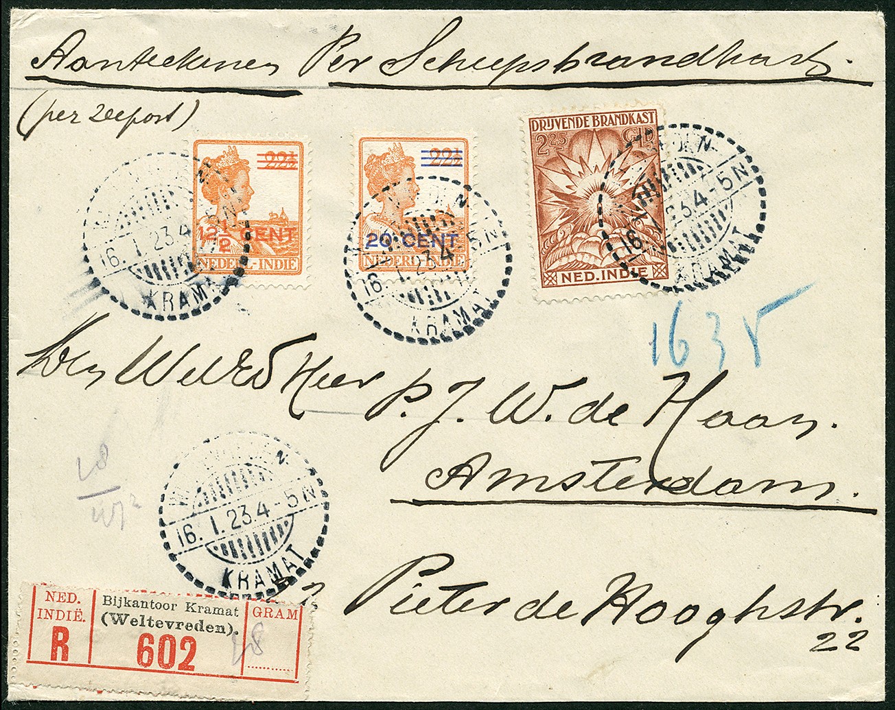 BK5, Brandkastzegel van 2,25 gulden tezamen met nrs. 143/44 op aangetekende envelop van Weltevreden- / Kramat 16-1-1923 naar Amsterdam. Zeldzaam op poststuk, slechts 797 ex. voor gebruik verkocht