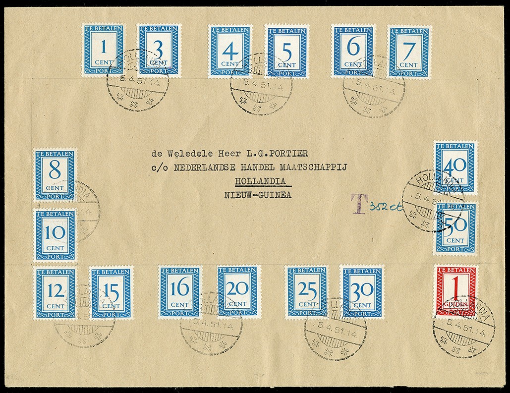 Nederlandse portzegels van 1 cent t/m 1 gulden op couvert, keurig afgestempeld Hollandia 5-4-1951