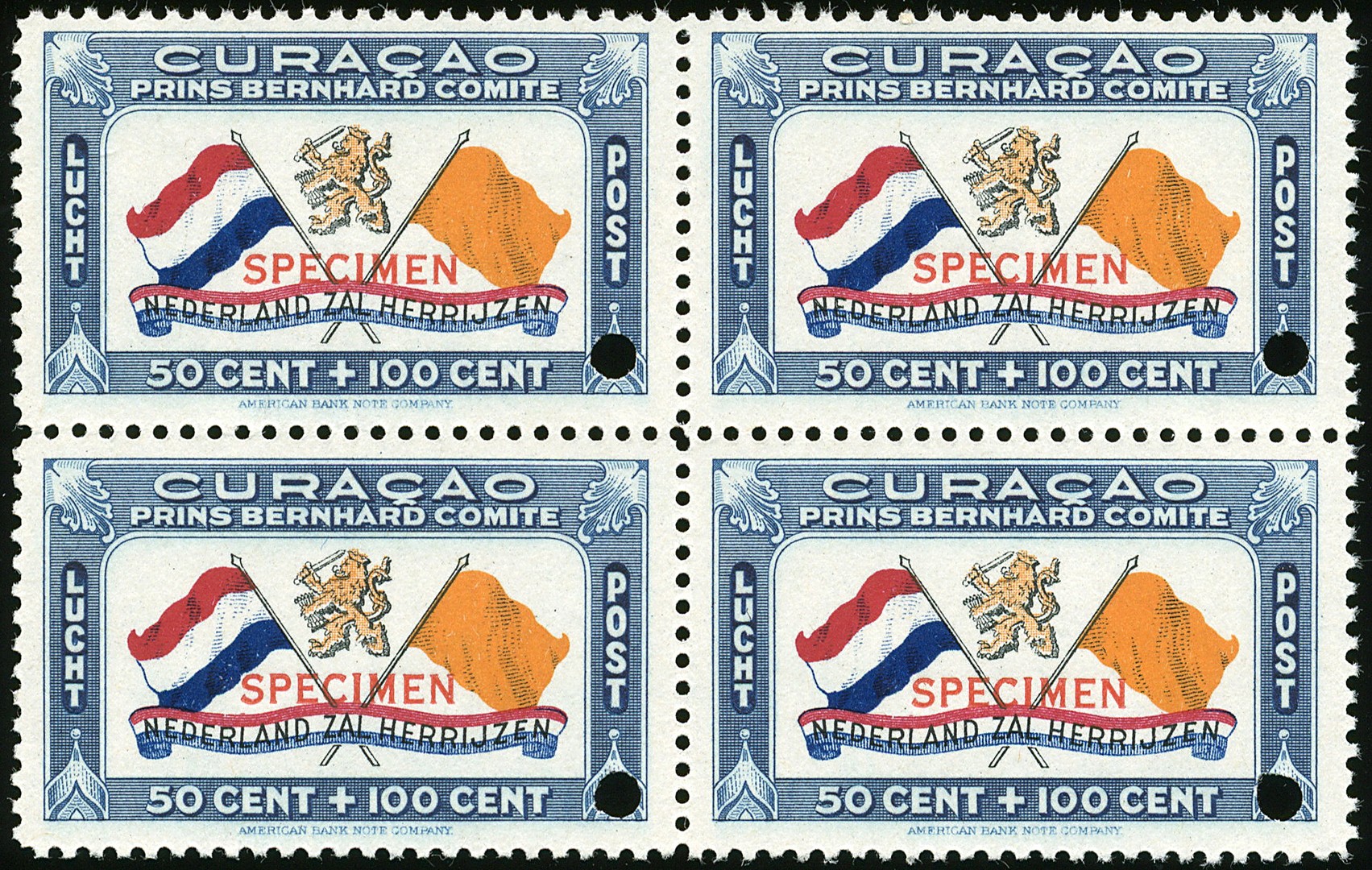 LP18/25, Prins Bernhardfonds 1941, met rode opdruk 'Specimen' en perforatiegat in luxe postfrisse blokken van vier. Oplage slechts 200 series!
