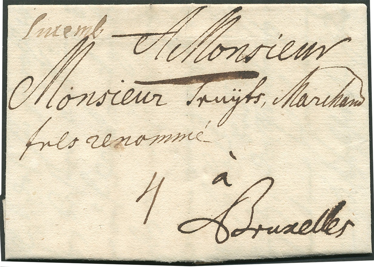 Oostenrijkse Nederlanden. Postdienst onder Thurn en Taxis. Postdienst via Luxemburg. Twee bijzonder frisse vouwbrieven naar Brussel. Brief van Luxemburg 10-2-1733 met geschreven 'Luxemb' met als port '4' sols, alsmede brief uit Trier 14-7-1758 met rechtsboven droogstempel 'De Treves.' en als port '10' sols. Dergelijke brieven uit Luxemburg worden slechts weinig aangeboden!