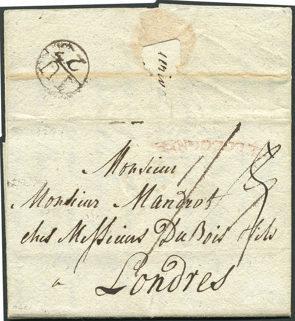 Oostenrijkse Nederlanden. Postdienst onder Thurn en Taxis. Frisse vouwbrief van Keulen 16-6-1794 o.a. via Maaseik en Oostende naar Londen met op vz. diverse portnotities en in rood 'De Cologne' en op az. 'Bishop Mark'. Attest 'James van der Linden, 1997'