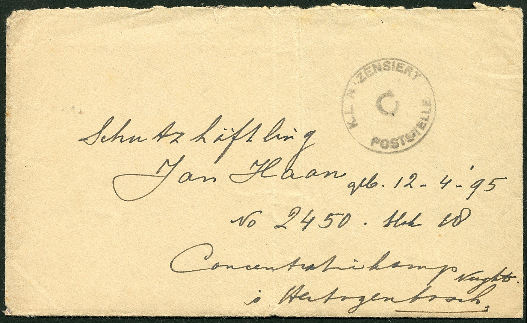 Kamp Vught. Cpl. brief van Groningen 20-7-1943 ('Lieve man. Vandaag mag ik je weer schrijven.') naar een in 'preventieve hechtenis' genomen persoon, met op env. en brief rond censuurstempel 'K.L.H. Zensiert / Poststelle'. Tevens gerepareerd couvert van de Waffen SS via de DDPN 1-7-1943 naar de vrouw van de andere brief in Groningen