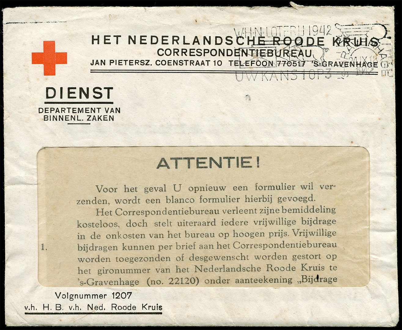 Rode Kruis. RK-vensterenv. uit 's-Gravenhage 24-9-1942 met daarin 2 aan elkaar zittende blanco RK-formulieren, toelichting (Attentie!) van het Correspondentiebureau, alsmede originele Aanwijzingen voor het gebruik van deze formulieren