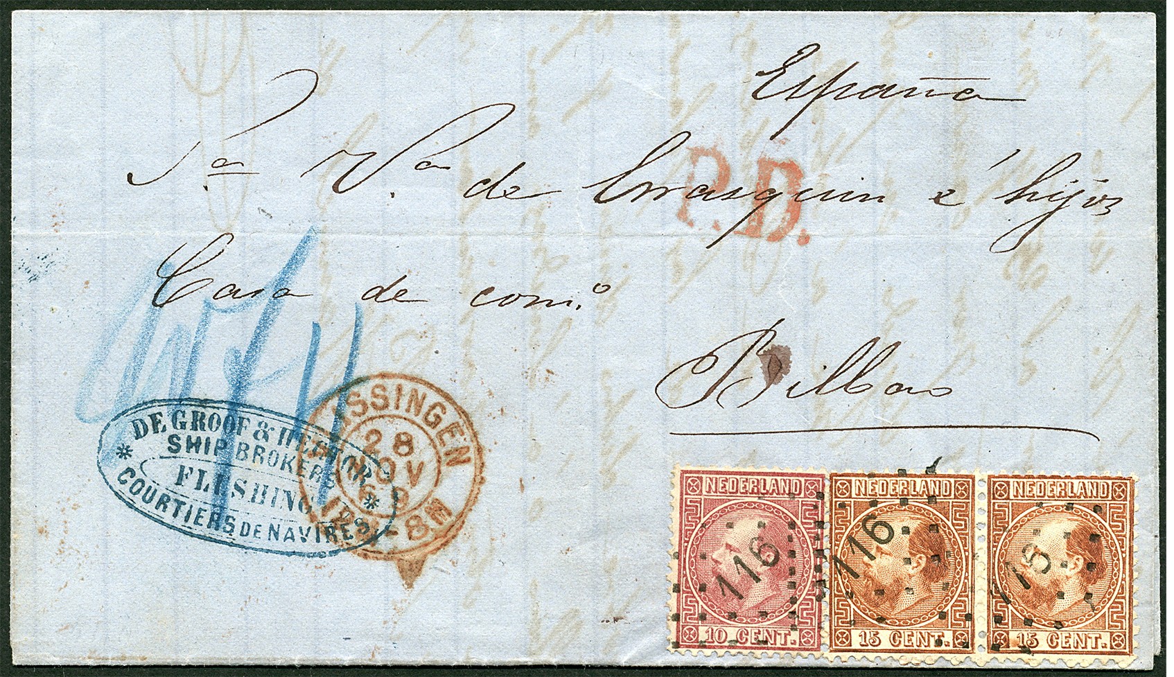10 CENT NR. 8IIC (PRACHTEX.) EN 15C NR. 9IA IN PRACHTPAAR, MOOI AFGESTEMPELD MET NUMMERSTEMPEL 116, OP FRISSE VOUWBRIEF VAN DE GROOF & HECTOR, SCHEEPS-COMMISSIONAIRS TE 'FLESHING', VAN VLISSINGEN 28-11-1869 DEELS PER SPOORWEG VIA OBERHAUSEN 29-11 NAAR BILBAO, SPANJE, 2-12. OP VZ. TEVENS 'P.D.' IN ROOD. PRACHTIGE, ZELDZAME BRIEF IN BIJZONDER GOEDE KWALITEIT EN PRONKSTUK VOOR IEDERE 1867-VERZAMELAAR!