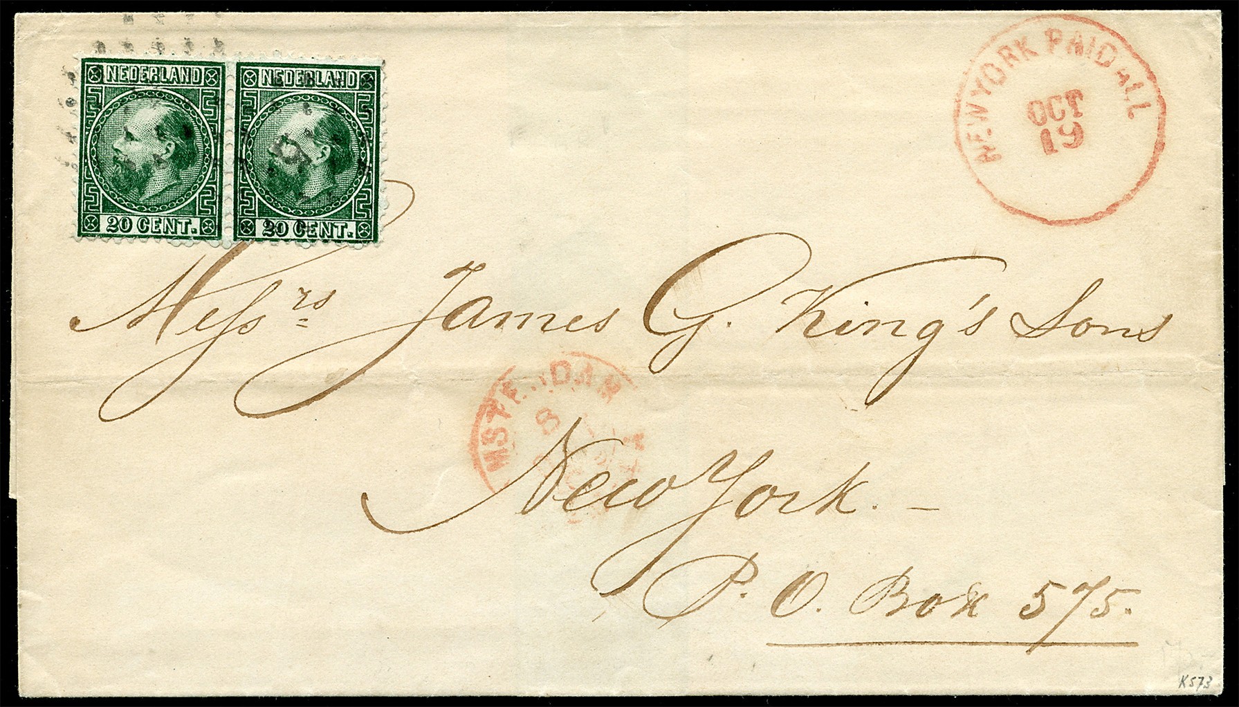 20 Cent nr. 10IA in prachtpaar op frisse briefomslag van Amsterdam 8-10-1869 naar New York 19-10