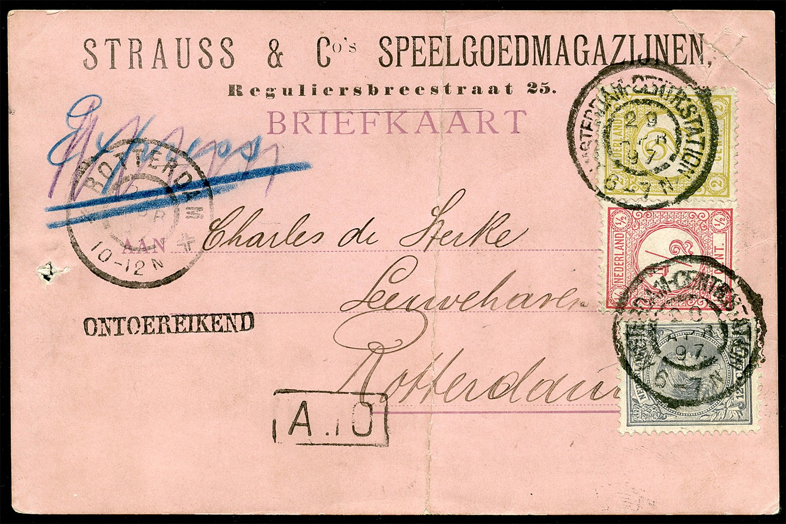 Part. bk. (vert. vouw) gefr. met ½c, 2c en 12½c van Amsterdam C.S. 29-4-1897 naar Rotterdam 29-4, met 2½ cent ontoereikend gefr. voor expresse en daarom doorgehaald