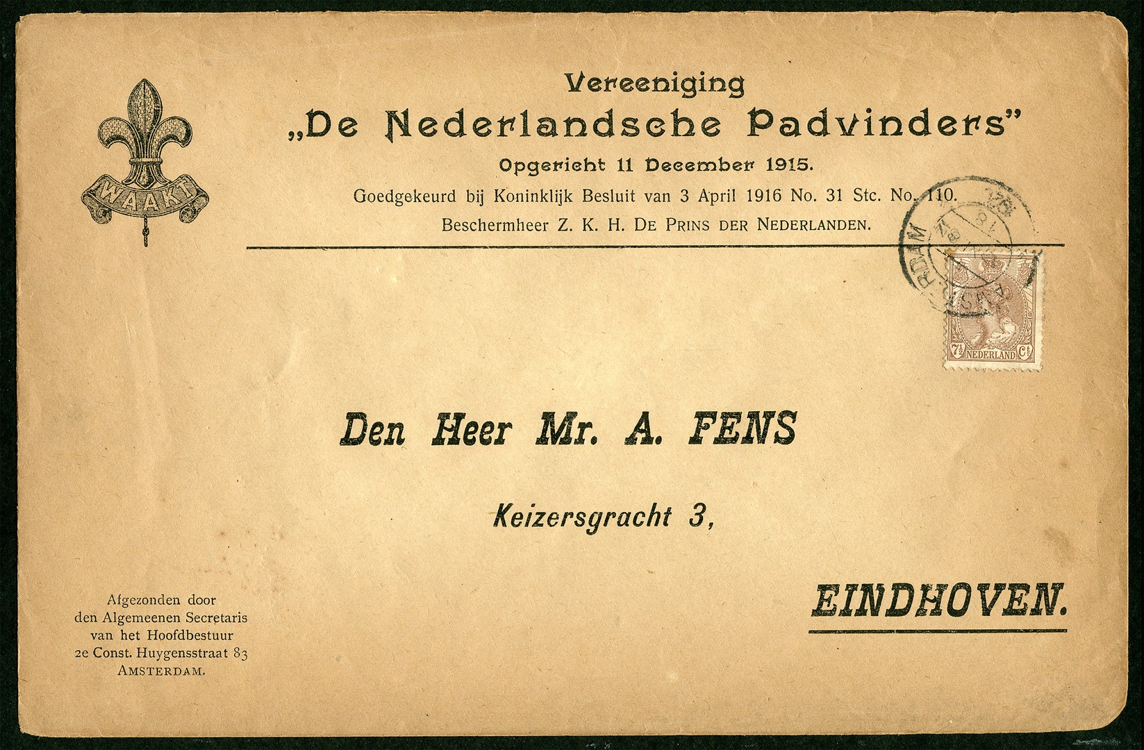 Grootformaat mooi bedrukt couvert van de Vereeniging 'De Nederlandsche Padvinders' van Amsterdam 12-11-1920 naar Eindhoven 13-11