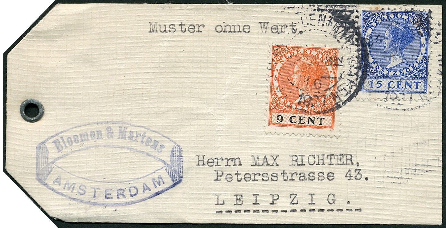 9 Cent nr. 152 (prachtex.) en 15c (vr. prachtex.) Veth op label voor monster zonder waarde van Amsterdam CS 22(?)-11-1927 naar Leipzig