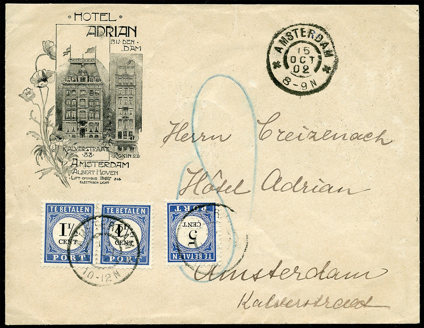 Prachtig bedrukt hotelcouvert ongefr. locaal verz. te Amsterdam 15-10-1902 en beport met 8 cent (P15 in paar, P19)