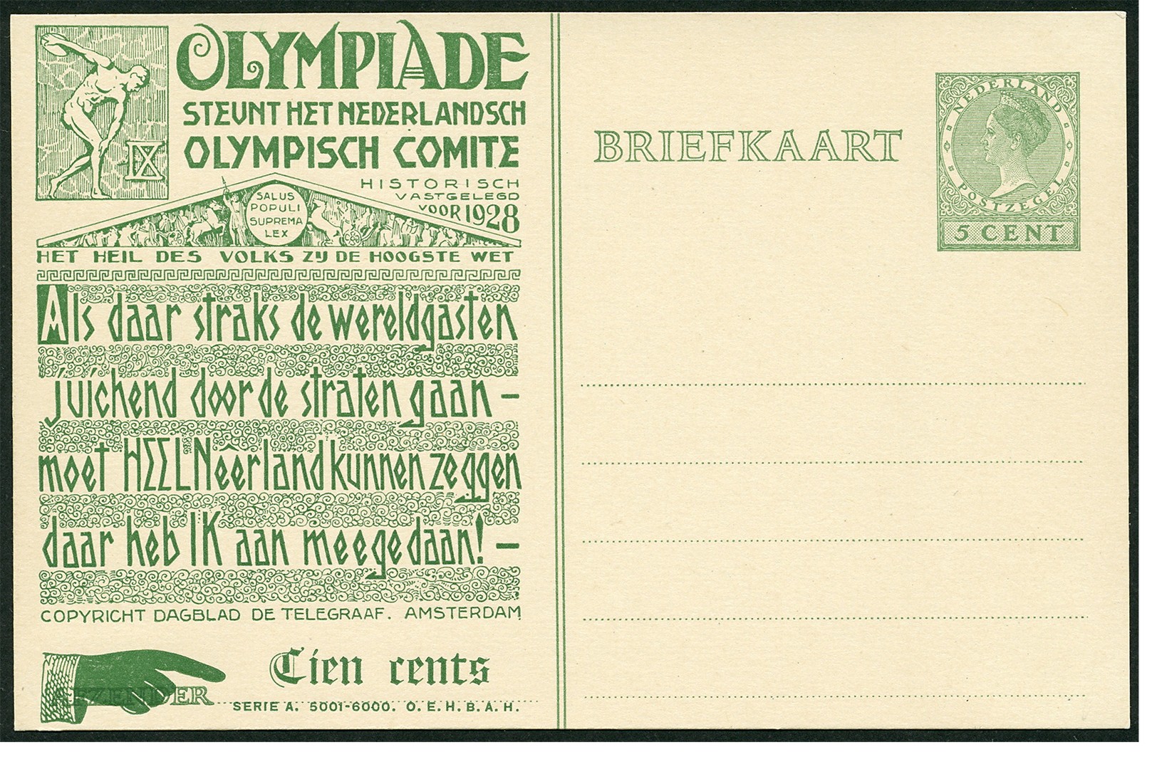Particulier bedrukte bk. Olympiade 1928, OL 14 (serie A. 5001-6000.). Ongebruikte prachtkaart